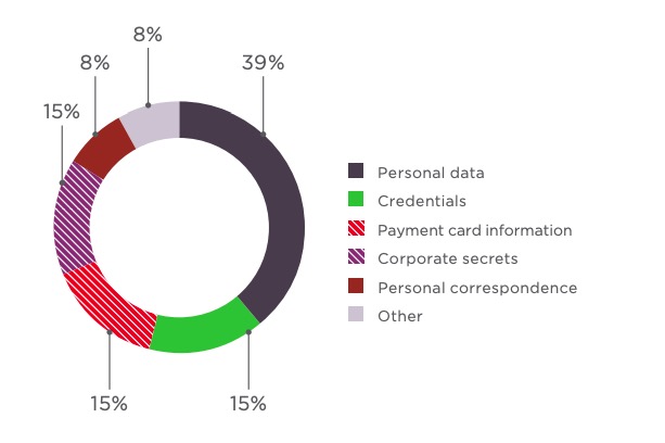 In Q4 2018, attackers targeted credentials (usernames and passwords) in 28 percent of attacks. These credentials were used for different services and systems, including corporate email. Note that in most cases, attackers do not have to use special software to obtain this information. People continue to use their birthdays, dog names, and other public information for their security questions. Personal data was stolen in 27 percent of cases, while payment card information was stolen in 16 percent. Towards year's end, attackers intensified their efforts to plant malicious scripts on websites to steal user-entered information.
