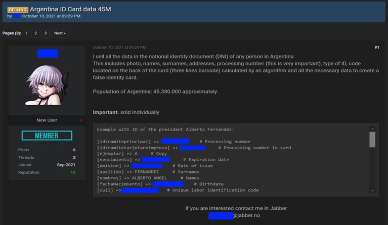 In October, an unknown hacker carried out one of the most high-profile hacks of 2021 by gaining access to the Argentinian National Register of Persons (RENAPER), a government database, stealing the personal data of the country's entire population (around 45.3 million people), and putting it up for sale on the dark web. The stolen data included ID card photos and details.