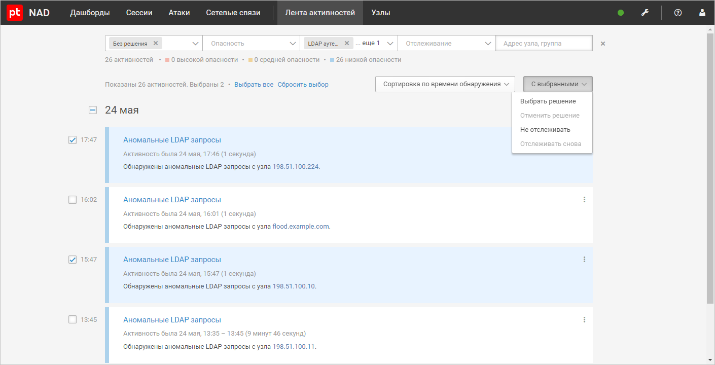In addition, a listing of user sessions has been added to the PT NAD 10.3 activity stream. In other words, it is now easier for an infosec expert to detect attacks to steal information about users authenticated on a host.