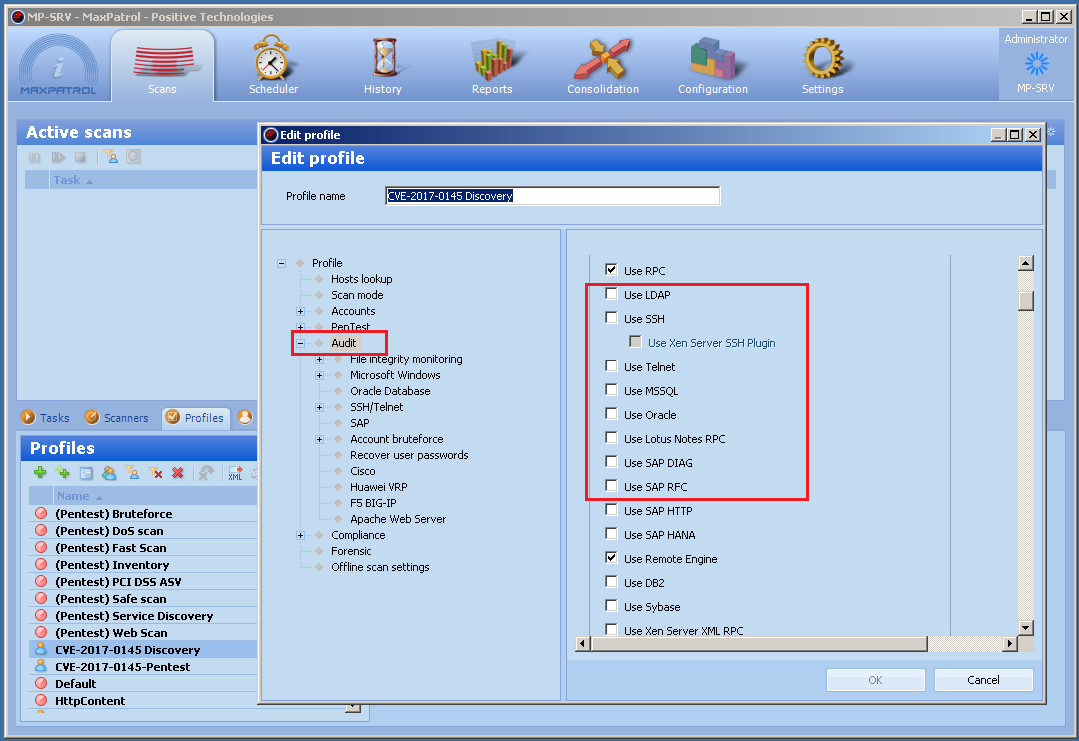 - In the Scan settings in Audit mode, disable the use of LDAP, SSH, Telnet, MSSL, Oracle, Lotus Notes RPC, SAP DIAG, SAP RFC.