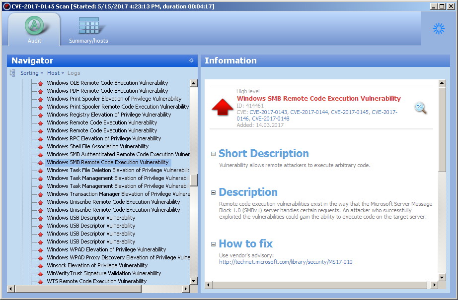 If the computer is vulnerable, the entry "Remote code execution associated with Windows SMB"appears in the scan results.
