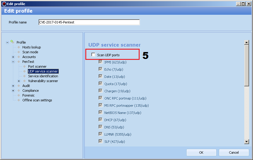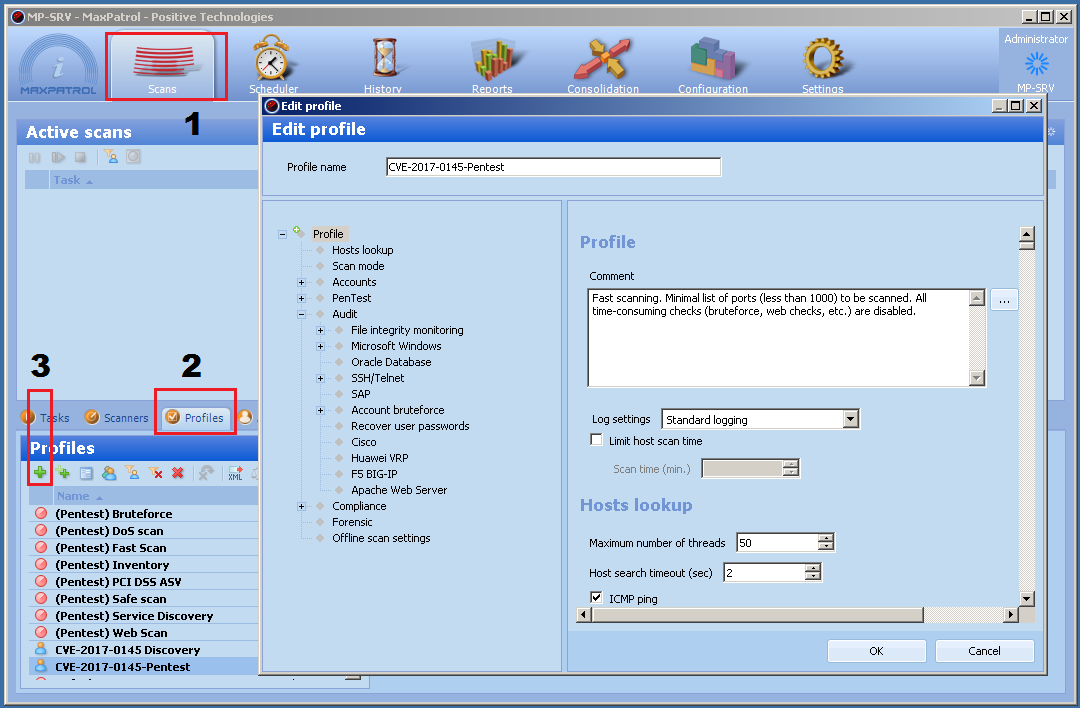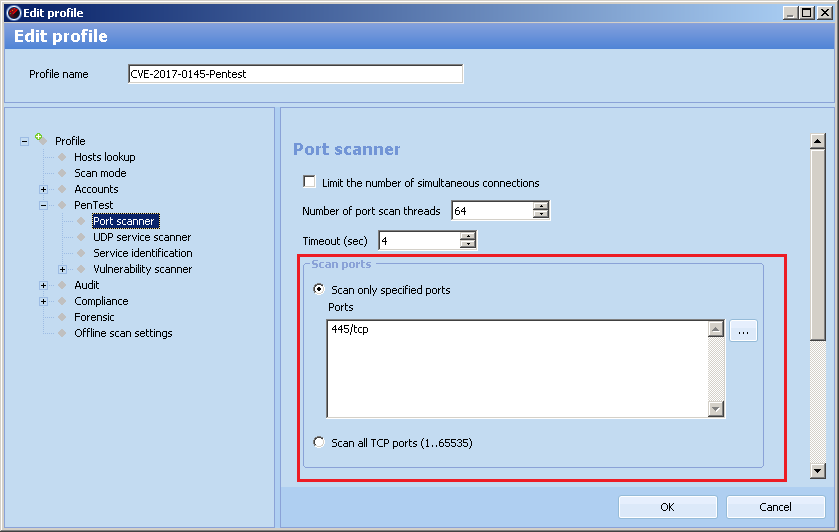 To perform a quicker and simpler scan for all nodes vulnerable to CVE-2017-0145, the update 8.25.5.25482 was released for detecting the vulnerability in Pentest mode. Instructions for creating a lightweight Pentest profile: