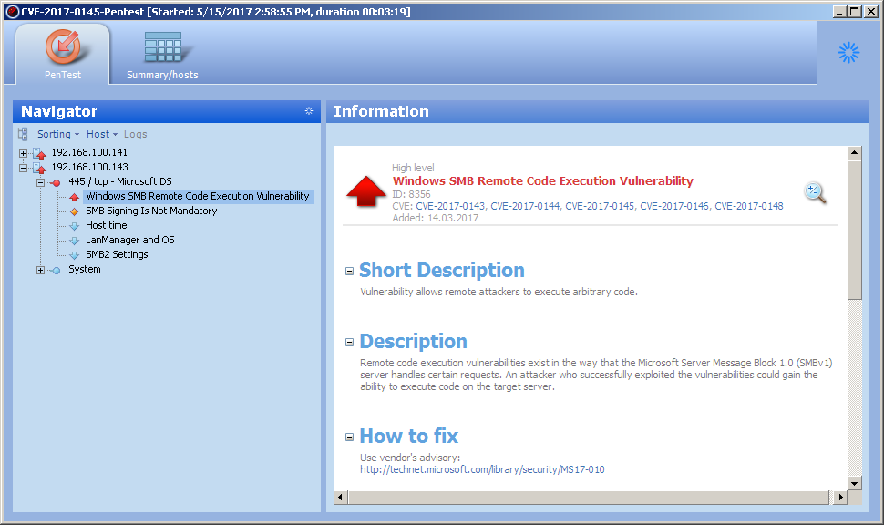 APPENDIX No. 3. Scanning for the vulnerability CVE-2017-0145 EternalBlue in Pentest mode