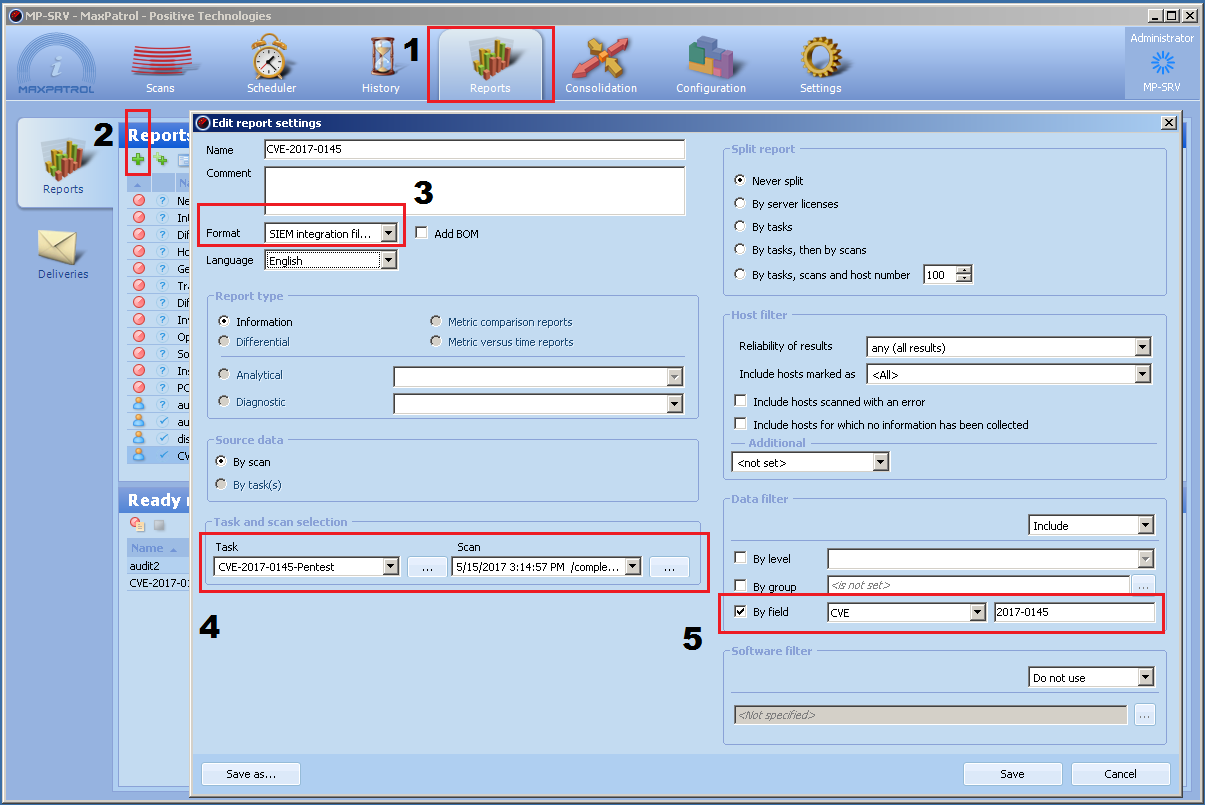 Information about the vulnerability CVE-2017-0145 (Windows SMB Remote Code Execution Vulnerability) is available in the MaxPatrol 8 knowledge base, starting with build 8.25.5.25279 (if an earlier build is used, an update is required). The vulnerability is detected when scanning the node in Audit mode. If scan results for build 8.25.5.25279 are already available (and the systems were not updated after scanning), you only need to prepare a report to obtain a list of vulnerable nodes. The most convenient report is in table view containing only the nodes with this vulnerability. You can export it to another system and install the update.