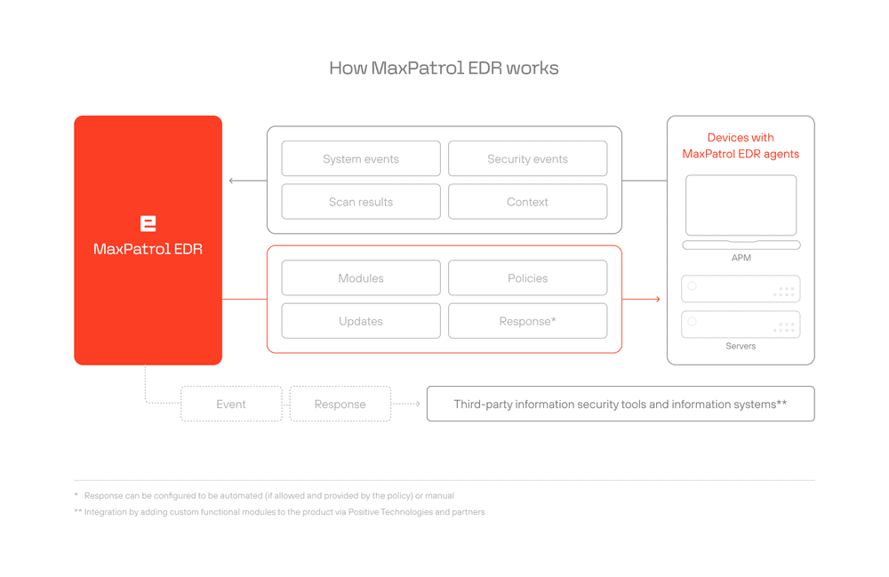 MaxPatrol EDR ayuda a detectar amenazas sofisticadas y ataques dirigidos rápidamente, a responder con determinación y a automatizar las operaciones rutinarias de un modo que resulte lógico para la infraestructura y los procesos de ciberseguridad específicos de la empresa.